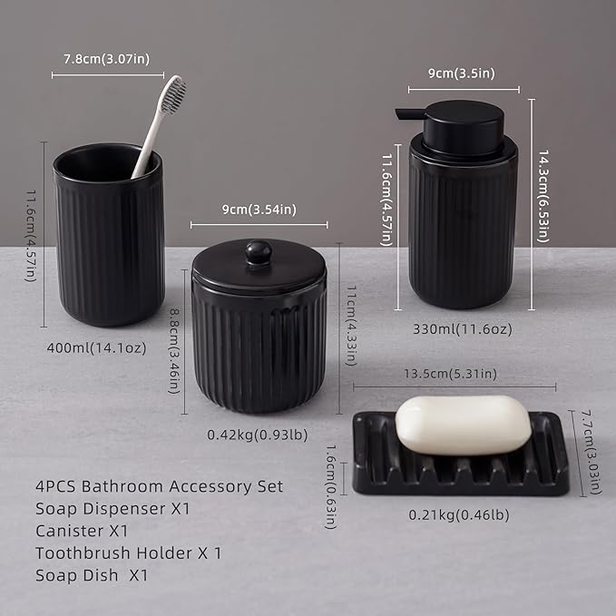 - Complete Bathroom Accessories Set:This is a complete bathroom accessory set that includes: 1pcs liquid soap dispenser,1pcs tumbler, 1pcs soap dish,1pcs canister. Providing everything you need to keep your bathroom fully functional.