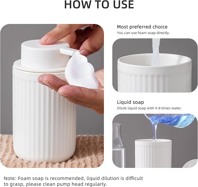 - Ceramic Foam Soap Dispenser :Can be filled with a variety of daily use foam soaps, or liquid soaps (Please dilute the liquid lotion with 4-8 times water and stir well.)Allows you to use less soap while producing more lather. Foaming detergent is recommended.