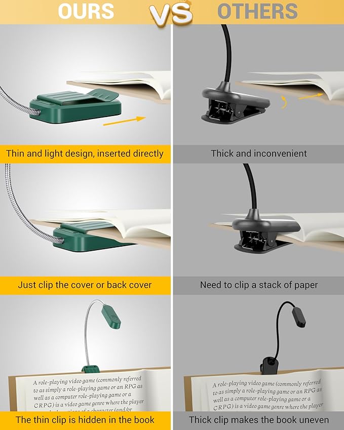 - 【360° Flexible Neck & Sturdy Clip】- The reading lights for books in bed have a 360° adjustable gooseneck, which can be easily adjusted to the right position without shaking. The clip has a tight and thin design, so it can be inserted directly into a book and hold a small amount of paper to keep it stable and enjoy reading with peace of mind. Lights with non-slip padded clips can also be used as a night light or supplemental lighting for work.
