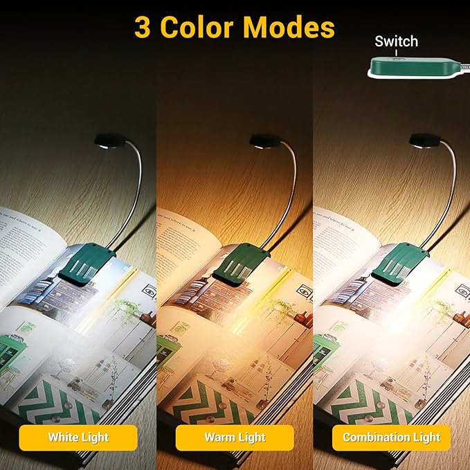 - 【3 Color Modes & Stepless Dimming】- This book reading light has 3 color temperature modes: white light (5 LEDs, 6000k), warm light (4 LEDs, 3000k), and mixed light (9 LEDs, 4500k). Long-press the brightness adjustment button to adjust the brightness from 10% to 100%, which can meet various needs in different reading environments. No flicker, shadow, or glare.