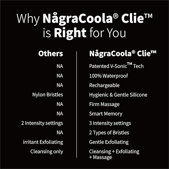 - DEEP CLEANSING: It features an iconic handle design. CLIE 2.0 face cleansing brush equips professional-caliber technology that uses pulsation to cleanse deeply. Featuring sophisticated V-Sonic Tech, NågraCoola face scrubber gently clears pores without harsh abrasion or chemicals, cleansing so effectively that skin care products absorb better. Results includes 6X better cleansing than manual cleansing, reduce appearance of pores, and improve skin tone.