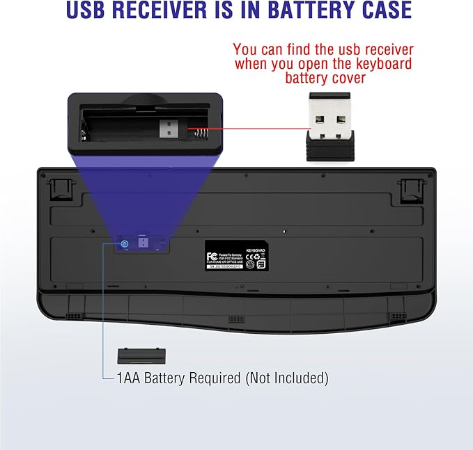 - 【Plug & Play 2.4G Wireless Keyboard】This wireless keyboard is plug & play, no need to download any software. 2.4 GHz wireless provides a powerful and reliable connection up to 33 feet(10m) without any delays. Note: The USB is in the battery compartment of the keyboard, you can find it when open the keyboard battery cover.