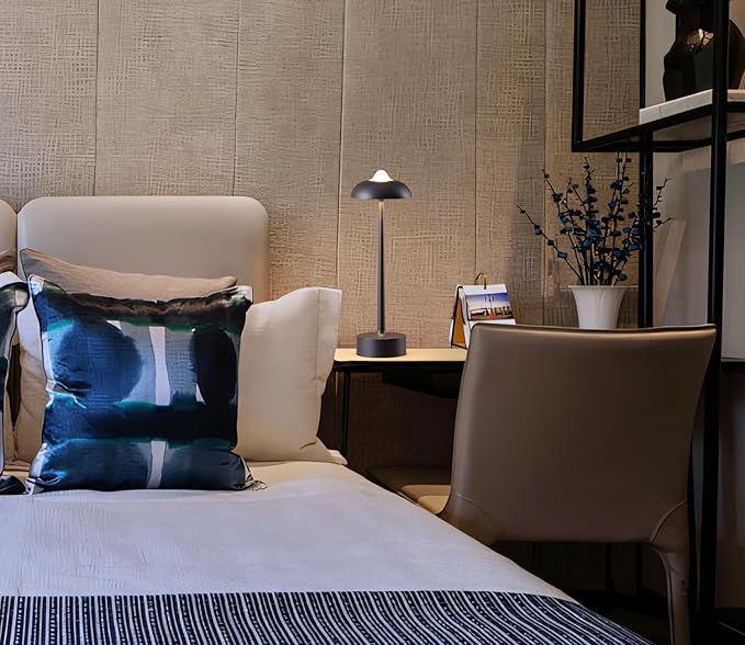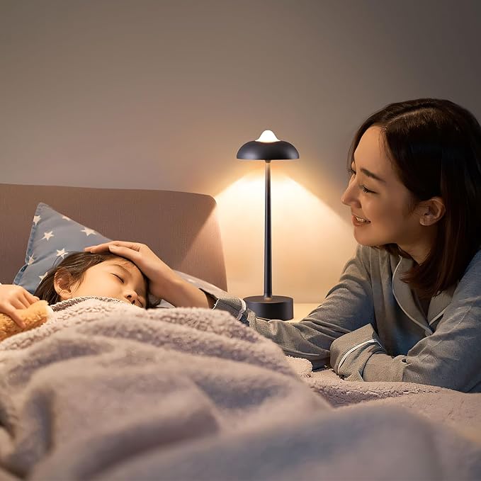 - 【360° Versatile Lighting Solution】:Experience cordless freedom with our modern mushroom-shaped LED desk lamp featuring 3-step touch control. Engineered with a 5200mAh lithium battery delivering 6-9 hours runtime (3-4h full charge via Type-C), this IP44 waterproof aluminum lamp transitions seamlessly from bedroom reading light to camping essential. Choose from warm amber (2700K), natural white (4000K), and cool daylight (6500K) - all with smooth dimming from 5% to 100% brightness.