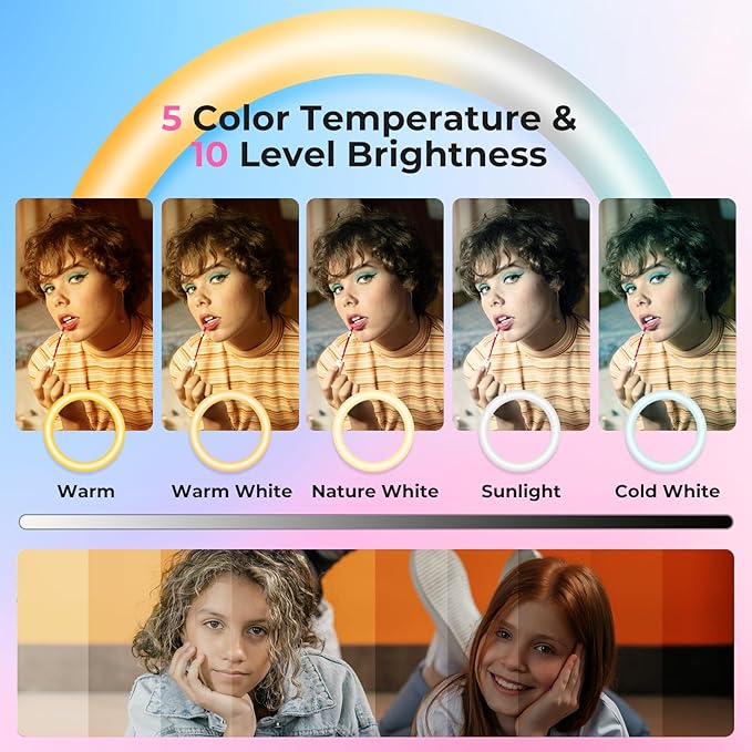 - User friendly Touch Control: Our LED ring light provides 5 colors (warm, warm white, nature white, sunlight, cold white) and 10 brightness (10%-100%) to meet your various needs. It features a highly sensitive touchpad to control the lights. Which will be more convenient and have longer life than traditional mechanical buttons.