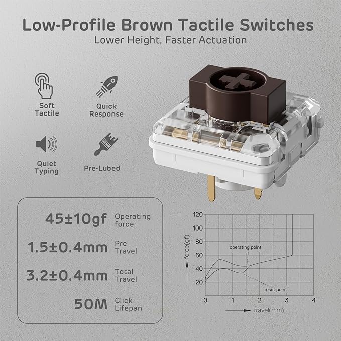 - Lower Profile, Faster Actuation — Compared to traditional height switches, RK custom low-profile switches feature a shorter actuation distance, leading to faster response time and an effortless typing experience. Perfect for both gaming and office work.