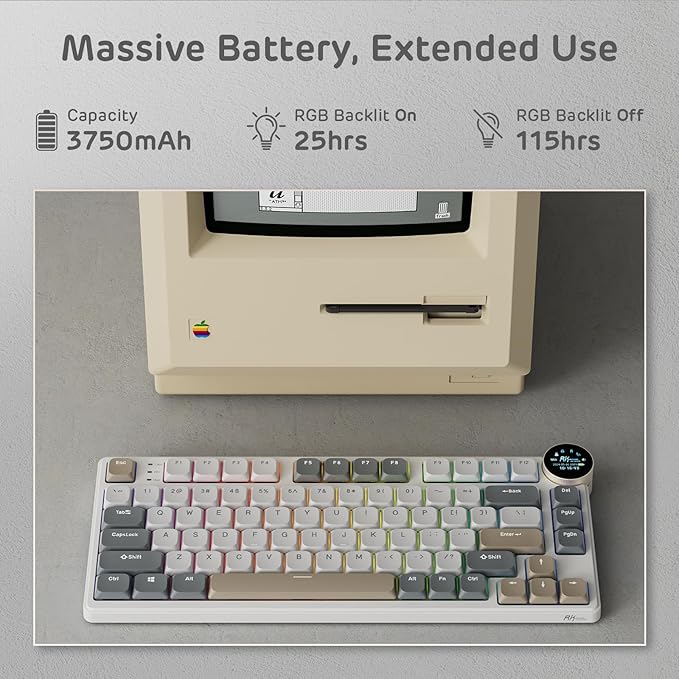 - Compact Screen, Intuitive Knob Control — RK N80 wireless keyboard redefines versatility. A dynamic display showcases custom GIFs, dates, connection modes, WIN/MAC layouts, and battery status on its small screen. Effortlessly control volume, connection modes, backlit brightness/speed, and RGB modes/colors with a simple twist or click of the knob.