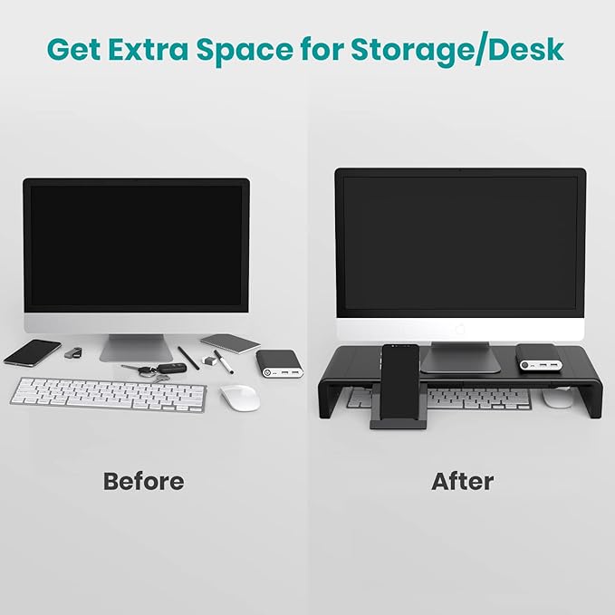 - 【Ergonomic Monitor Riser for Desk】 Achieve a comfortable viewing height for your monitor, reducing strain on your back and neck during computer work. The stand also provides extra space underneath to neatly store the keyboard and mouse when not in use. This desk monitor stand is a perfect desk organizer and space saver.