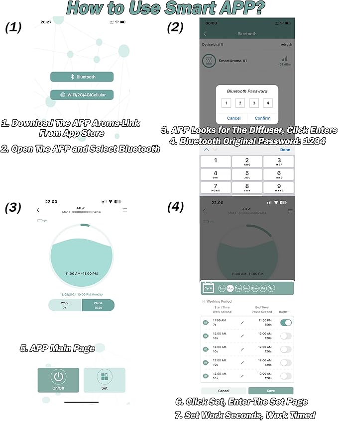 - 【BLUETOOTH SMART APP CONTROL】The waterless aromatherapy diffuser is very easy to control for every customer. Download the app AROMA-LINK, use the bluetooth to connect with your fragrance machine, setting the working time. It will more easy to know how to use it than the regular diffuser with buttons. If you do not know how to use the app, please contact us.