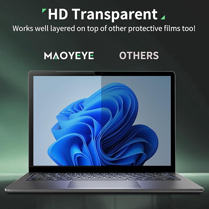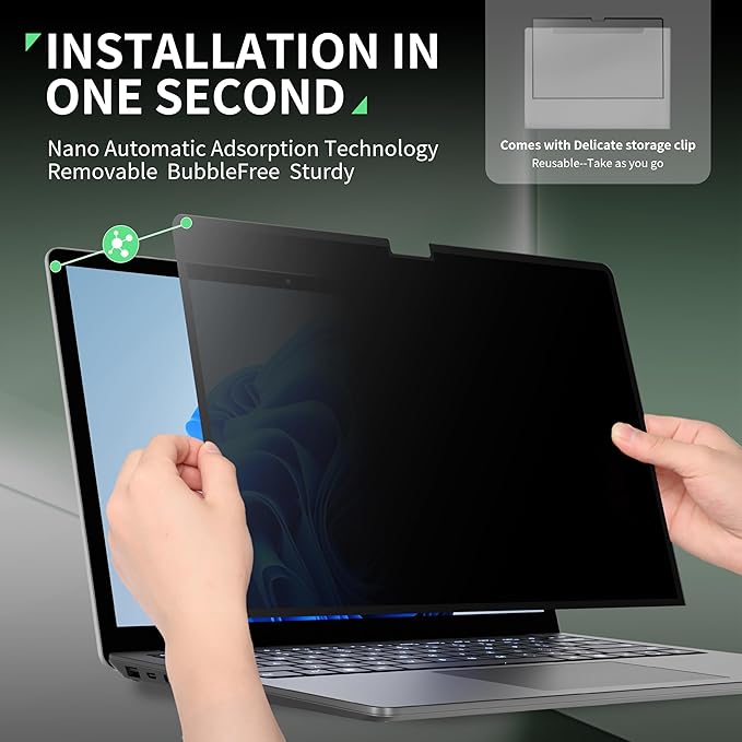 - 【REMOVABLE & REUSABLE】Our 13.5’’ laptop screen privacy shield has Nano adsorption strips on all sides. Simply align it with the screen bezel, press it gently, and you're ready to go! If you want to take it off it's also easy, just peel it off, no tools needed, no bubbles, no glue residue. What's even sweeter is that it comes with a delicate storage clip, which can keep the anti-spy screen film well when you take it off