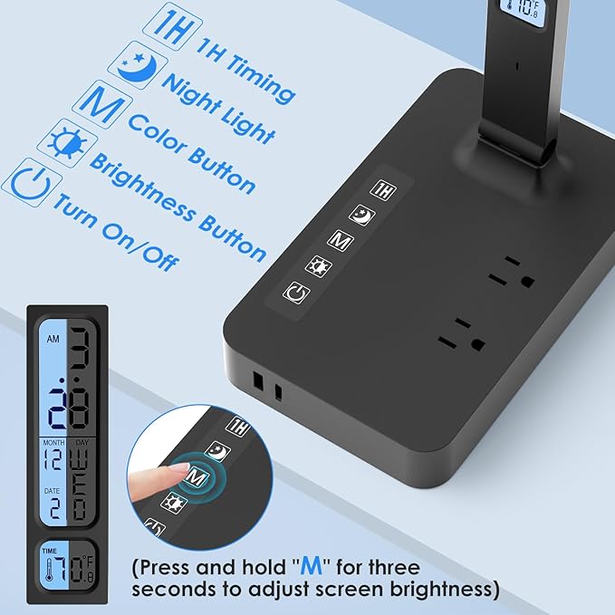 - [Surge Protection]: If the total power is too high when using high-power electrical appliances, the desk lamp will automatically shut down and cut off the power, protecting our expensive equipment.