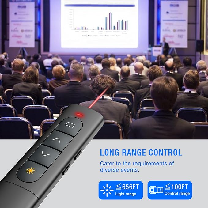 - 【Remote/Light Range】Enjoy unparalleled flexibility with a wireless signal control range of up to 328 feet and a light indicator visibility that extends up to 656 feet. Whether you're presenting in the largest conference room or teaching from any corner of the classroom, this slide advancer seamlessly keeps you in command. It's not just a controller, it's a powerful pointer tool for presentations.