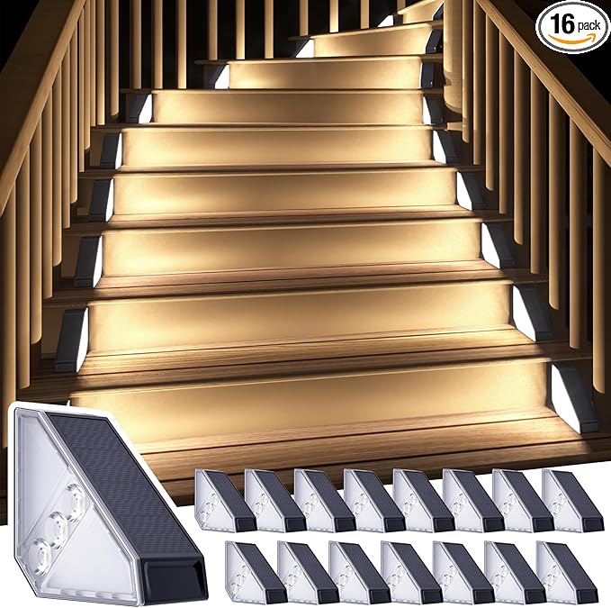 ROSHWEY Solar Step Lights for Outside, 16 Pack Solar Powered Stair Lights Outdoor Waterproof, Triangle Deck Step Light, Outdoor Decor Lighting for Front Porch, Backyard, Patio, Cool White