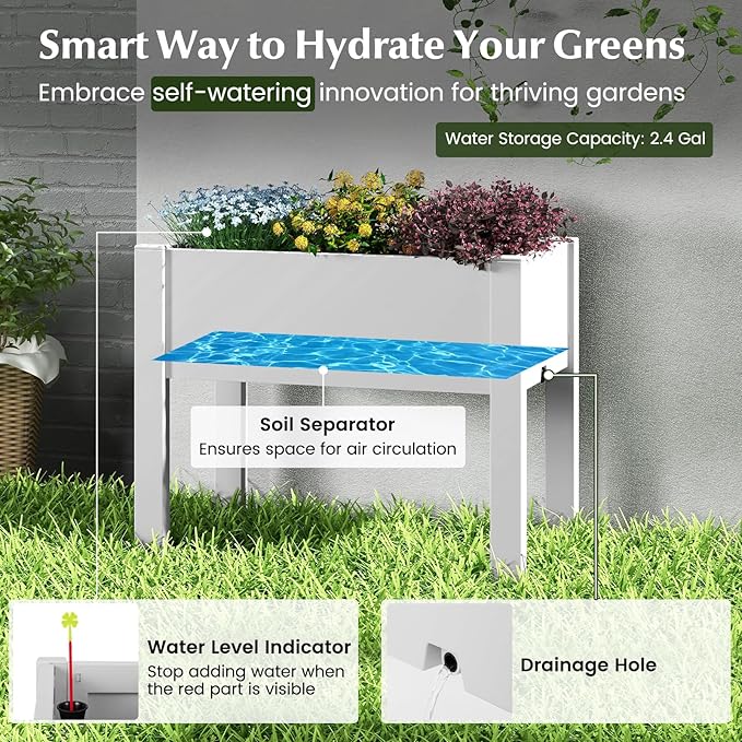 Giantex Raised Garden Bed with Legs, Self-Watering Planter Box with Water Level Indicator, Drainage Hole & Detachable Space Dividers, Outdoor Plant Container for Flower, Vegetable, Fruit, Herb (White)