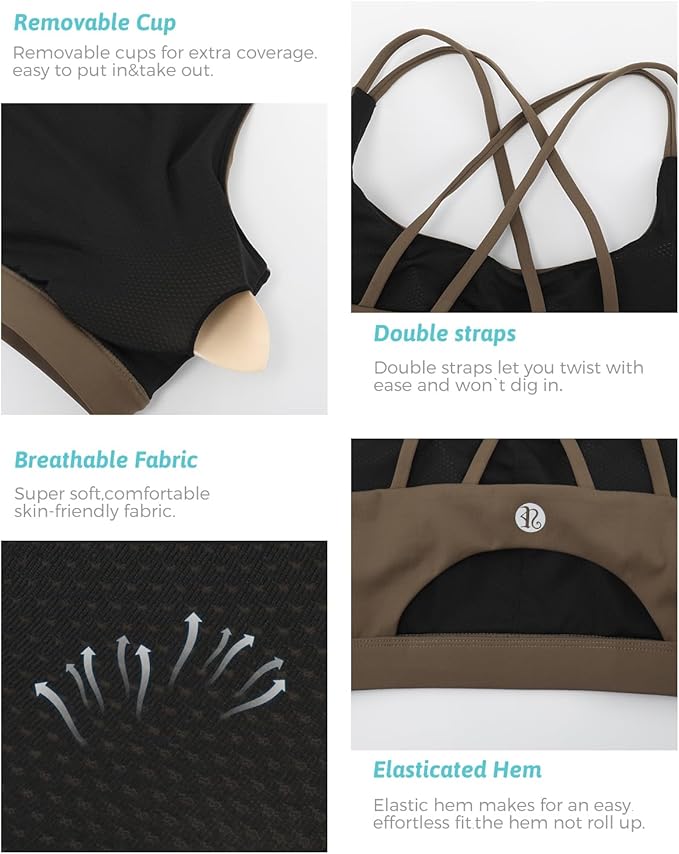 - √YOUR SECURE FIT - Strappy design meets sporty style. Super soft scoop neckline with light, removable pads. Open cutout back styling sports bras for women medium support, widen band underneath the breast ensures a tight secure fit. Removable cups for extra coverage. The removable vertical cotton bra pads are easy to clean.The padded sports bra which always retains its shape and prevent bra bulges, caresses your figure to adjust to your curves.