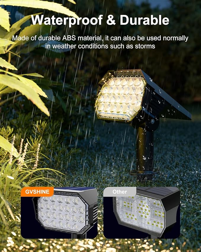 - Fully Lens-Enclosed, Superior Shine: Our solar spot lights outdoor features 24 high-brightness LED beads, each meticulously enclosed in its own individual spotlight lens cover. This innovative cover design significantly enhances the solar powered spotlight focusing ability, delivering a brighter, more concentrated illumination compared to same size solar panel and battery capacity configuration solar spotlight.