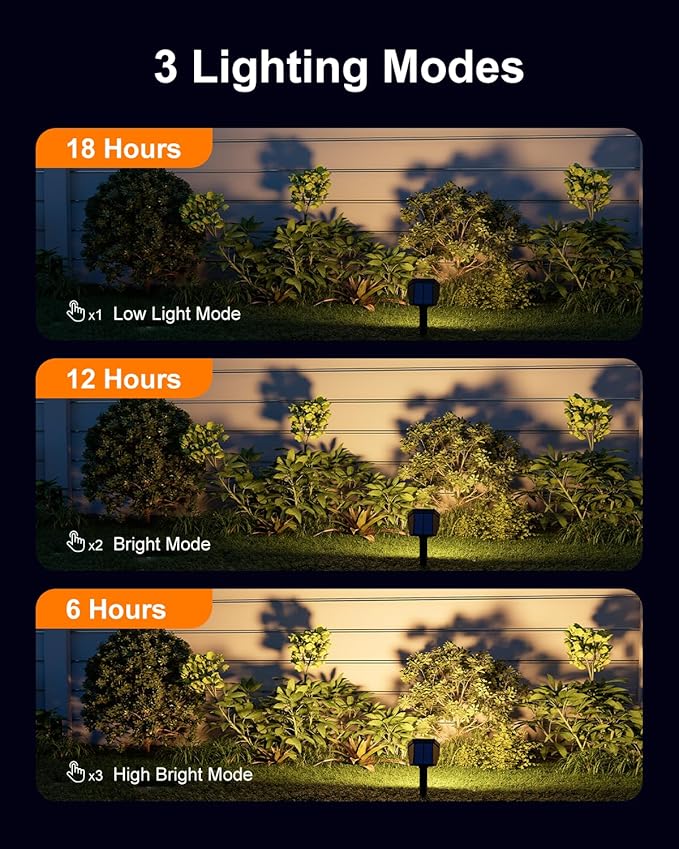 - 3 Modes Setting for Every Scene: Our solar landscape spotlights offers three brightness modes to ensure you get the ideal lighting effect for different occasions. With low brightness (30%, 18 hours), illuminate shrubs and nearby landscapes, creating a cozy ambiance. Medium brightness (60%, 12 hours) suits pathways or sculptures, enhancing nighttime safety and aesthetics. High brightness (100%, 6 hours) lights up gates or walls, improving visibility in the distance.
