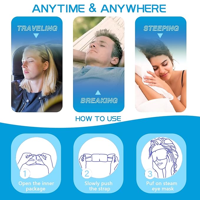- 【Relieve Dry Eyes & Eye Fatigue】: Our SPA Warm Steam Eye Masks provide instant relief for dry eyes, eye fatigue, puffiness, and dark circles. The self-heating design releases fine moist steam to soothe and hydrate the delicate skin around your eyes, promoting better blood circulation and improving sleep quality.