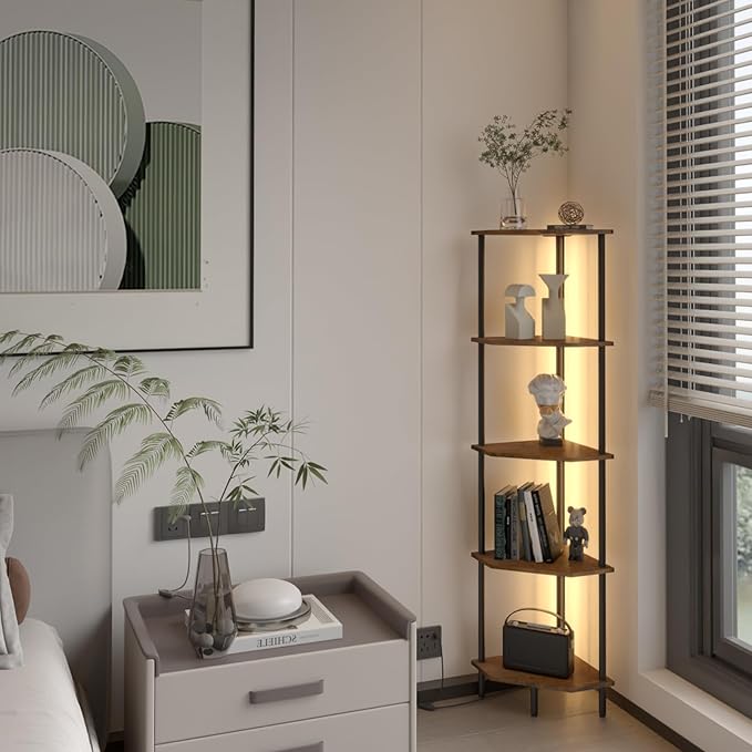 5 Tier Corner Shelf with LED Light,Tall Standing Shelf Organizer,Narrow Bookshelf,The Classic Combination of Rustic Brown and Black Standing Bookcase,Suitable for Bedroom,Living Room,Kitchen
