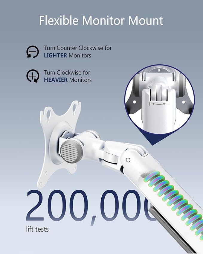 - 【Easy to Adjust】 E6 white monitor arm features a flexible movement structure, which enables instant and effortless adjustments for ideal viewing heights, more efficient than traditional monitor mounts.