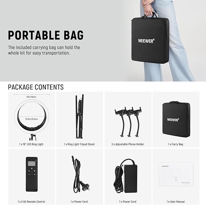 - 【Package Contents】 1 x 19" LED Ring Light, 1 x Ring Light Tripod Stand, 3 x Adjustable Phone Holder, 1 x Remote Control, 1 x Power Cord, 1 x Carry Bag, 1 x User Manual