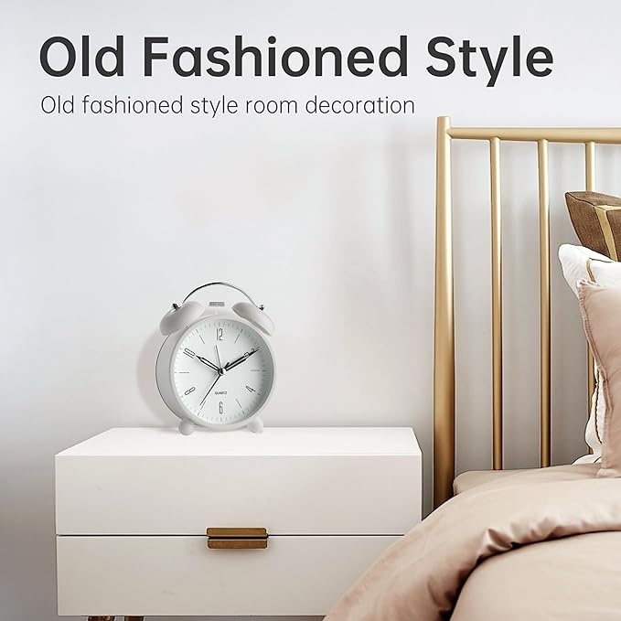 Twin Bell Loud Alarm Analog Alarm Clock, 4 inch Super Silent Non Ticking Small Clock with Night Light, Battery Operated, Simple Design, Old Fashioned, for Heavy Sleeper, Bedroom, Bedside, Desk, White