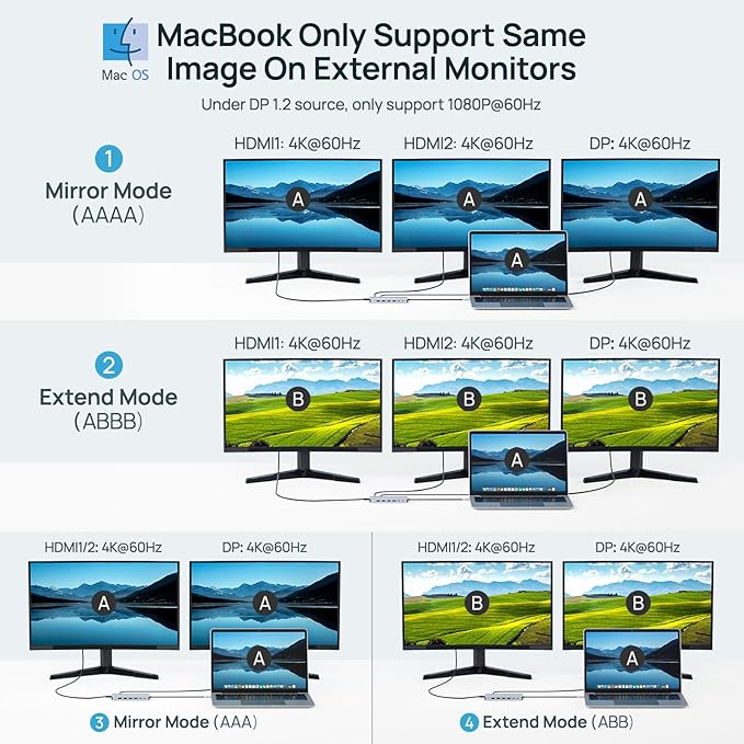 - 【Triple Display Docking Station Dual/3 Monitors】This laptop docking stations dual monitor with three high-definition video output ports: HDMI+HDMI+DP. While single use displayport resolution up to 8K@30Hz, single use HDMI resolution up to 4K@60Hz. Dual monitors will be 4K@60Hz or 4K@30Hz(DP1.4). Triple monitors will be 4K@60Hz or 4K@30H(DP1.4). Note: macOS does not support MST, three extended monitor shows the same screen