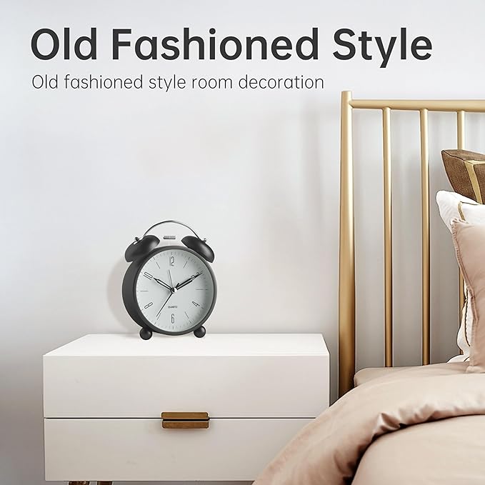 Twin Bell Loud Alarm Analog Alarm Clock, 4 inch Super Silent Non Ticking Small Clock with Night Light, Battery Operated, Simple Design, Old Fashioned, for Heavy Sleeper, Bedroom, Bedside, Desk, Black
