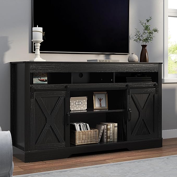 RoyalCraft Farmhouse TV Stand for 65+ Inch TV, Tall Entertainment Center with Storage Cabinets and Sliding Barn Doors, Mid Century Modern Media TV Console Table for Living Room (Black)