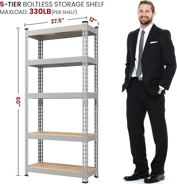 - Wide Application: This 5-tier boltless rack with six color options, a minimal structure, and adjustable shelves has wide usage and is suitable for offices, garages, living rooms, kitchens, workshops, warehouses, balconies, or anywhere needed