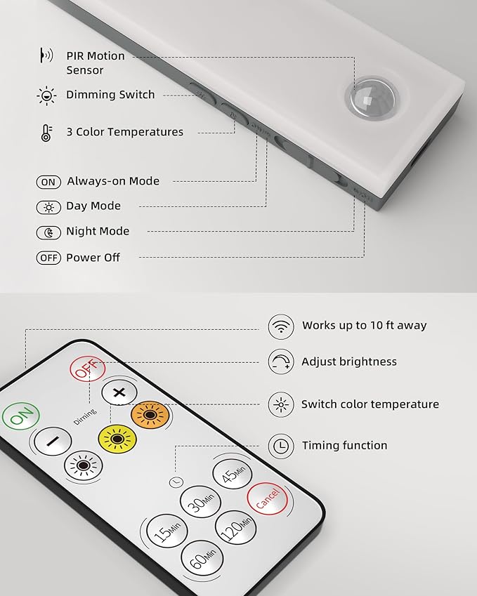 - Remote Control & Timer Features: Control these under counter lights easily with either the built-in buttons or the included remote. Set the closet lights to always on/off, adjust brightness, or switch between color temperatures. The remote also offers a timer function with six options, from 15 to 120 minutes, providing flexible control over how long the light stays on.