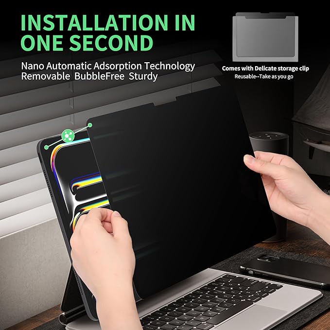 - 【EASY INSTALLATION】Strong magnetic attachment on top and bottom make our 2024 iPad pro 13 inch privacy screen protector more stable than others,install and remove in a second without residue and air bubbles. What's even sweeter is that it comes with a delicate storage clip, which can keep the anti-spy screen shield well when you take it off