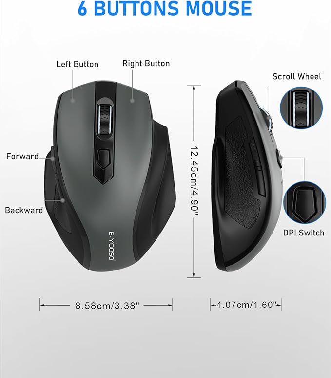- 【5 LEVELS DPI & 6 BUTTONS】: E-YOOSO wireless mouse has a 5-Level adjustable DPI (800/1200/1600/2400/4000), which provides more sensitivity than standard optical mice for smooth and precise. Extra 2 Side Buttons ideal for both work and gaming