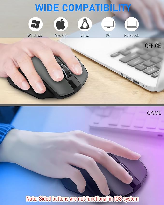- 【UNIVERSAL COMPATIBILITY】: The Large wireless optical mouse is long-lasting and versatile. Portable for travel use. Work with Windows laptop/MacBook/Chromebook/PC -Any Device with USB Ports. Side buttons are unavailable for Mac OS