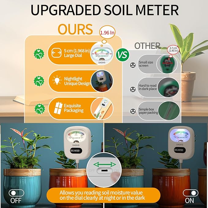 - 2025 UPGRADED SOIL TESTER: Our soil moisture meter utilized advanced tech, which provides more accurate readings. User-friendly intuitive design makes it easy to use. Moreover, it added features a lighting LED for clear reading in all lighting conditions.