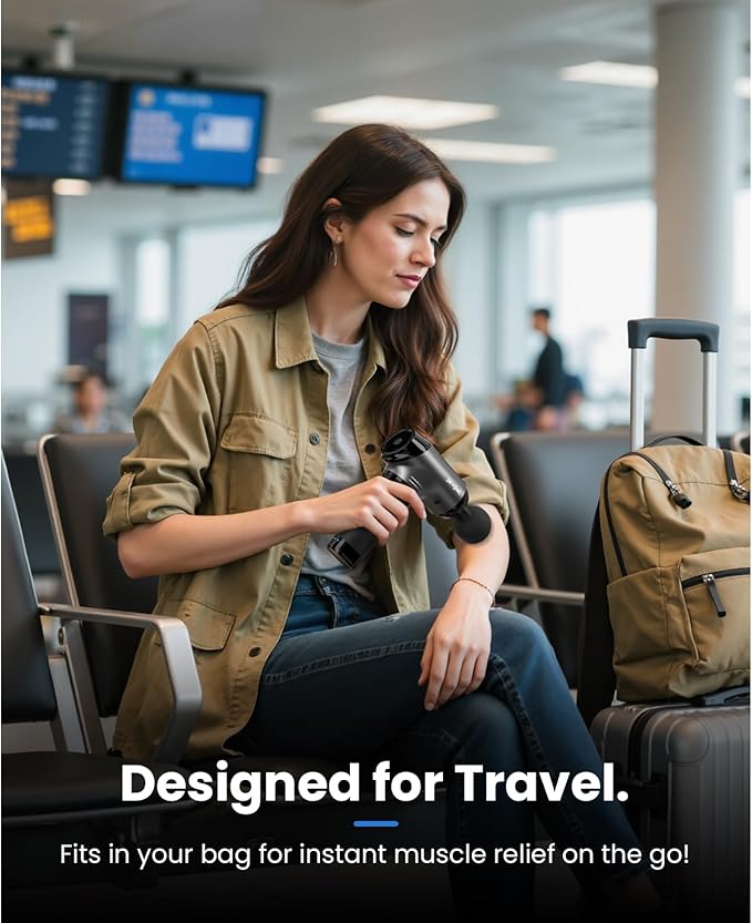 - Quiet and Portable Massage Gun: Designed for on-the-go relief (Weighing just 1.9 lbs), this compact massage gun fits effortlessly in your gym bag, backpack, or suitcase. Its ultra-quiet operation (<45dB) makes it perfect for office use, travel, or home without disturbing others. Lightweight yet powerful, it delivers instant relief anytime at home or away. The essential companion for myofascial release and everyday aches and pains.