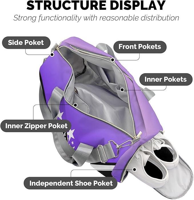 - Convenient Shoe Compartments: Dimensions;17.7x7.8x9.2 inch(LxWxH),capacity 21L, with multiple Compartment, Cheer Shoulder bag Weekender Bag, Sleepover Bags designed to accommodate your workout essentials. say goodbye to messy bags! Our duffel bag features separate shoe compartments, allowing you to keep your shoes organized and separate from the rest of your belongings. No more worrying about dirt or odors!