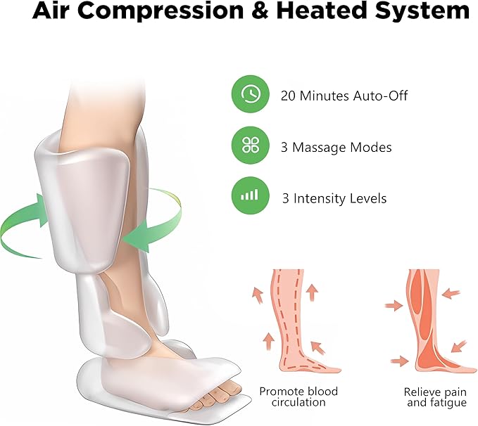 - 【Upgraded Heating Therapy】This leg and foot massager comes with a heating function, there are two heating levels for you to choose, warming your feet and legs. Meanwhile four airbags provide continuous air compression from legs to feet, which can effectively relieve limb pain and muscle tension, bringing you further comfort and relaxation. The product offers a 20-minute automatic shut-off function so you can use it with peace of mind.