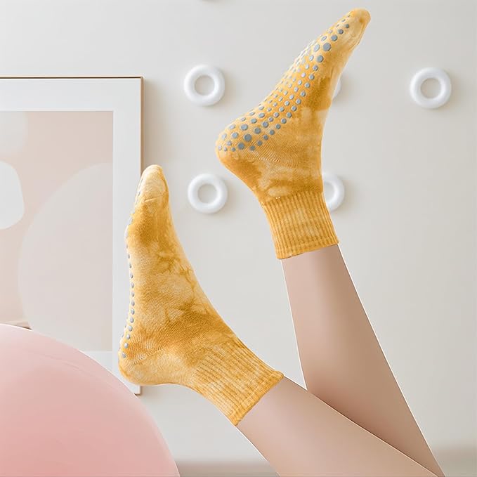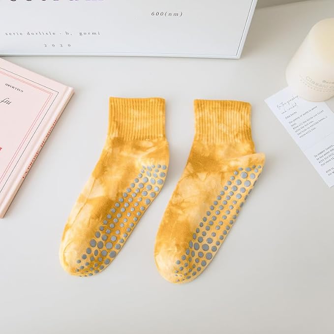 - Colorful Tie Dye Socks: Each pair of yoga socks features a vibrant tie-dye design in classic colors such as black, blue, purple, and yellow, adding a unique touch to your yoga style. Whether you're practicing in the studio or at home, these grip socks perfectly combine playful aesthetics with practical functionality. They bring a splash of fun to every session, making them a must-have for fashion-forward yoga enthusiasts.