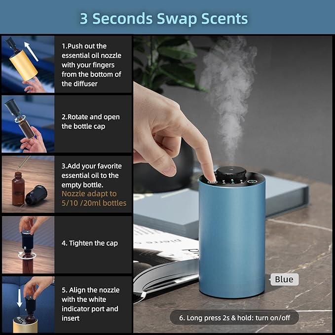 - 【Premium Metal Design & Effortless Refills】Crafted with aerospace-grade aluminum, this waterless diffuser blends luxury with sustainability. Scratch-resistant, sleek matte finish complements any décor (home, office, hotel, yoga studio). The patented detachable nozzle works with standard 5/10/15/20mL oil bottles—swap scents in 3 seconds, no spills, no fuss