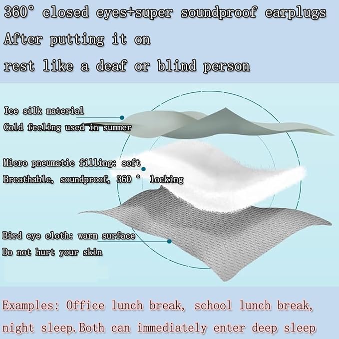 - Eye Mask+Earplugs: 360 ° blackout sleep mask, filled with micro air cotton material, the mask is very gentle and covers the eyes all night long, without squeezing the nose, ears, and skin, and will not harm the skin. At the same time, wearing silicone earplugs, soft material, will not squeeze the ears, with 4 levels of sound insulation effect, will make you sleep like a deaf or blind person, quickly entering deep sleep