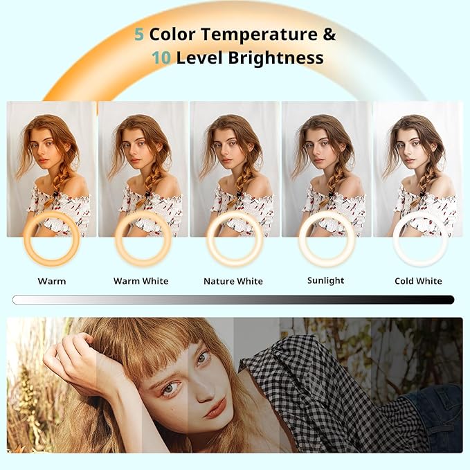 - User friendly Touch Control: This ring light for ipad provides 5 colors (warm, warm white, nature white, sunlight, cold white) and 10 brightness (10%-100%) to meet your various needs. It features a highly sensitive touchpad to control the lights. Which will be more convenient and have longer life than traditional mechanical buttons.