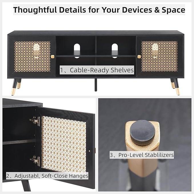 - Attractive Style: Mid-century modern TV stands combine fashionable metal elements with vintage wooden look. Its eye-catching golden metal mesh doors and stylish handles add a unique charm to your living room furniture. This TV console is perfect for a variety of decor styles