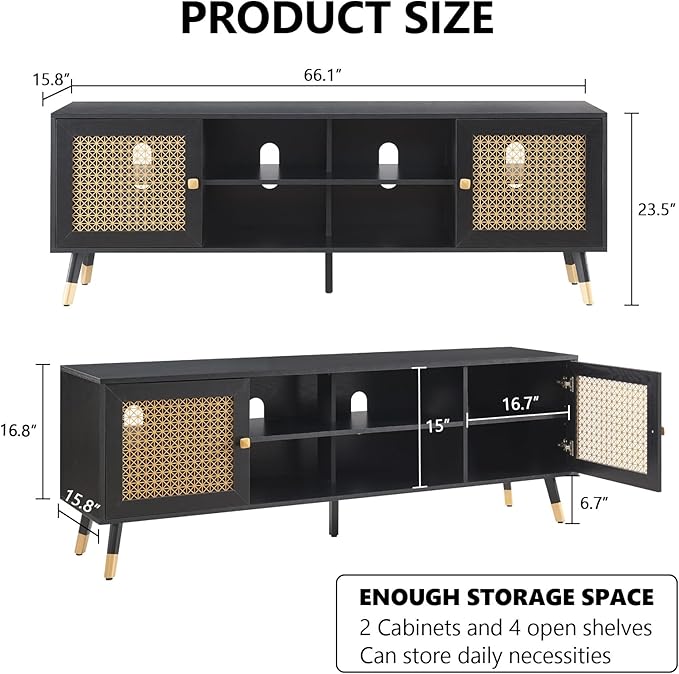 - Sufficient Storage Space: This storage cabinet table measures 66.1 "Wx15.8 "Dx23.5 "H with a weight capacity of 88 lbs. This wood TV cabinet consists of four open shelves and two storage cabinets, which can meet your daily needs, keeping your space neat