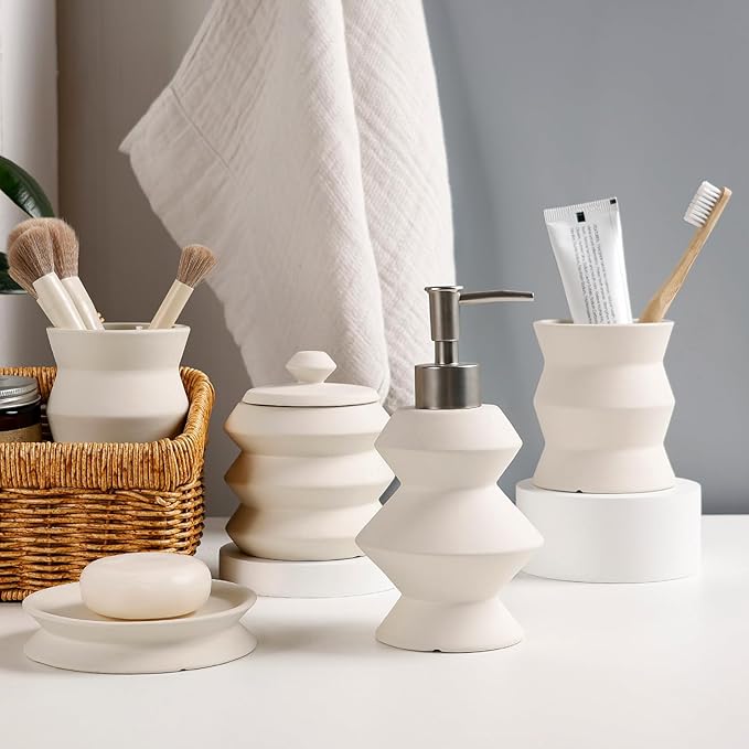 Bathroom Accessory Set 5PCS, Beige Ceramic Bathroom Accessories Set, Unique Design Small Bathroom Accessories Sets Complete, Home Apartment Minimalist Bathroom Decor Vanity Countertop, ANTIS'S HOME