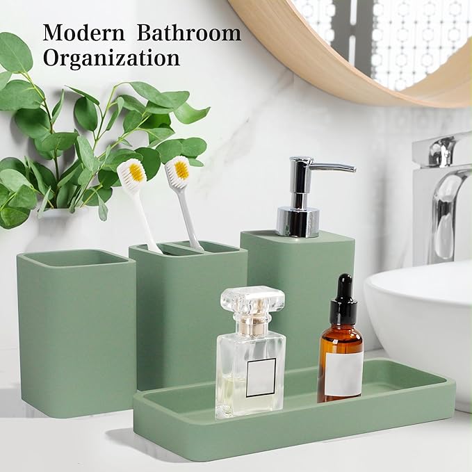 Bathroom Accessories Set, 4 Pcs Bathroom Accessory Set, Soap Dispenser, Toothbrush Holder, Qtip Holder Set, Bathroom Sets Complete, Bathroom Sink Set for Modern Home Decor,Green