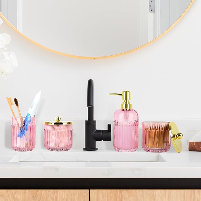 Bathroom Accessories Set,4 Pcs Pink Glass Bathroom Accessories Set with Toothbrush Holder,Lotion Soap Dispenser,2 Qtip Holder Dispensers - Countertop Organizer for Modern Bathroom Decor - Pink