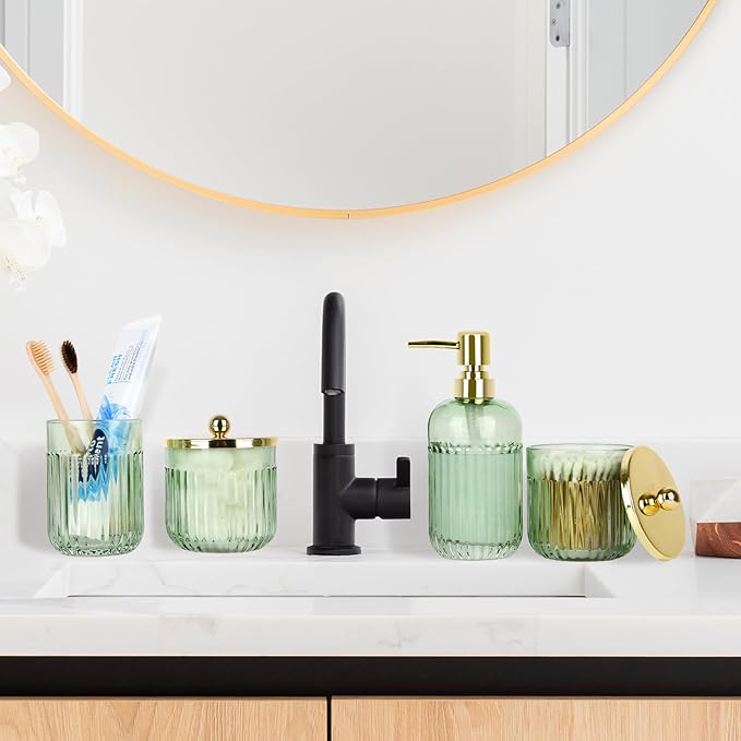 Bathroom Accessories Set,4 Pcs Green Glass Bathroom Accessories Set with Toothbrush Holder,Lotion Soap Dispenser,2 Qtip Holder Dispensers - Countertop Organizer for Modern Bathroom Decor - Green