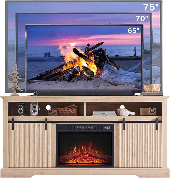 Fluted Fireplace TV Stand for TVs Up to 75 Inch, Modern Entertainment Center with Waveform Panel Sliding Door & Adjustable Shelves, Media Console for Living Room (Natural)