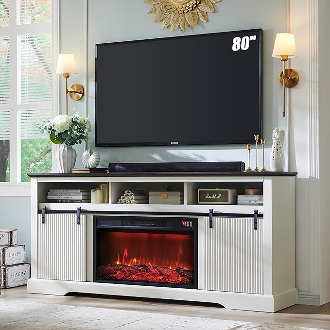 - 【Fluted Sliding Door】This TV stand with fireplace comes with 2 fluted waveform panel sliding doors that hide side storage cabinet or a electric fireplace. The fluted waveform panels combine artistic and modern style with visual appeal and provide a unique tactile experience.