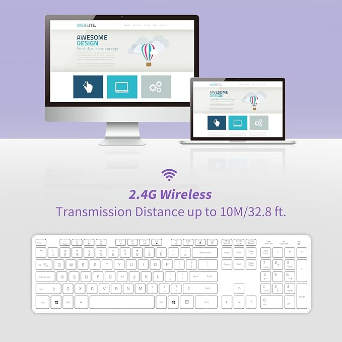 Slim Quiet Wireless Keyboard for Mac and Windows,Durable Flat Keyboard with Full Size Ultra Quiet Low-Profile Flat Keys, 2.4GHz Wireless for Mac,Windows 11/10/8/7/Vista,Microsoft & PC(White
